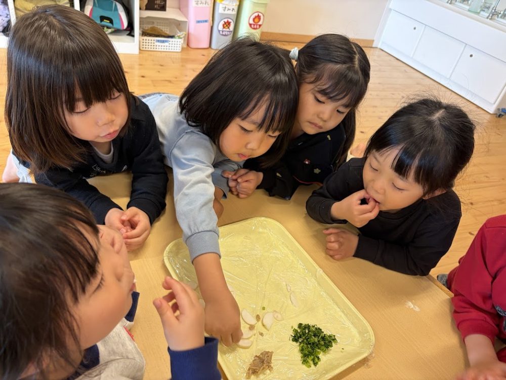 明日はお店ごっこ。年長組ではテラスや保育室を使って開店準備に大忙しの一日でした。降園時間のサークルタイムでは「明日は、お店ごっこだね!みんなの準備は大丈夫かな?」と言葉を掛けると、それぞれに今から準備するものに気付いたり、今あるものをもっと工夫したい!と意欲を高める様子が見られました。