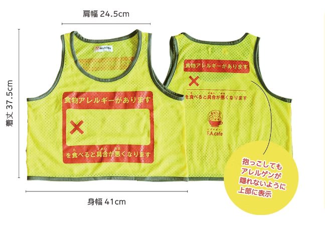 その際に、社会のアレルギーに対する理解の不足から「こんな時に好き嫌いするなんてわがままだ」と言われたこどもがいたそうです。そのときの子どもの気持ちを思うと、大変心が痛みます。そのようなことを起こさないために、いま注目されているのが【災害ビブス】です。好き嫌いではなく、アレルギーがあるのだと周りに知らせるものです。園では、ビブスの代わりに【災害時アレルギーカード】を準備しています。有事の際はカードを肩掛けにして避難します。錦ヶ丘ではナッツ類の提供は一切していませんが、ナッツアレルギーを持つお子様の災害時アレルギーカードも準備してあります。