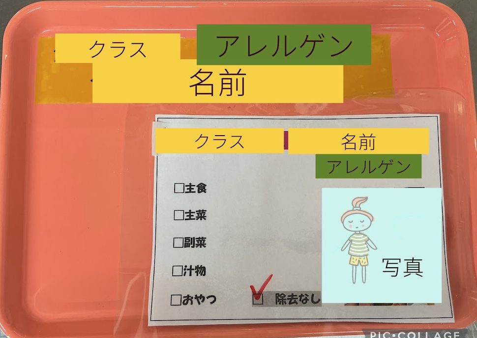 アレルギー対応が必要なお子様の給食は、個人の専用トレイにのせて提供します。トレイには【クラス、名前、アレルゲン】が貼られており、アレルギーカードも添えます。アレルギーカードには【クラス、名前、アレルゲン、その日の除去の有無】を記入しています。除去がある日は、おかわりも専用のものを準備します。除去が必要なメニューだけでなく、すべてのメニューのおかわりを準備することで誤食を防ぎます。