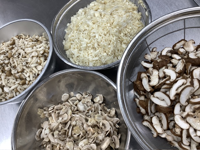 きのこを使用した給食も少しずつ増えてきましたが、きのこをランチルームに展示したり、給食紹介の放送できのこについて紹介しているからか、こどもたちの方から「これはえのきで、これはしいたけ」「えのきはすきだけどしいたけはきらい」と《きのこ》ではなく食品名がでてくるようになりました。