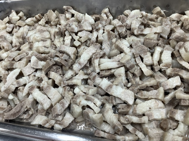 給食で豚バラ肉のブロックを使用する時は料理酒とスライスした生姜を加えて焼くことが多いのですが、今日は料理酒をたっぷり加え蒸しました。