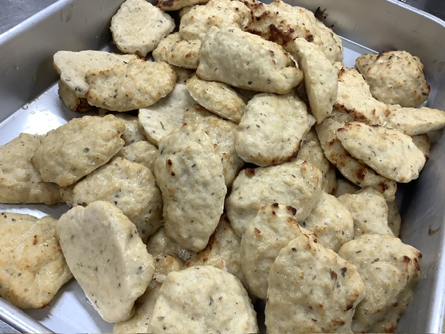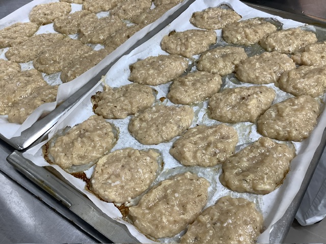 玉ねぎは細かく刻み、スチームコンベンションオーブンで焼いて甘みを出します。それらを鶏ひき肉、すりおろし生姜、麦味噌、酒、きび糖、片栗粉と水を入れてこねて焼きました。