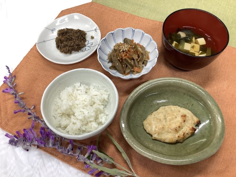 副菜のきんぴらごぼうには錦ヶ丘の調理法の1つである蒸し煮をしたごぼう、にんじん、大根、しらたき、油揚げが入りました。