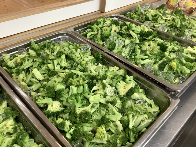 ブロッコリーは、スチームで蒸した後に氷を当てて色止めをしています。