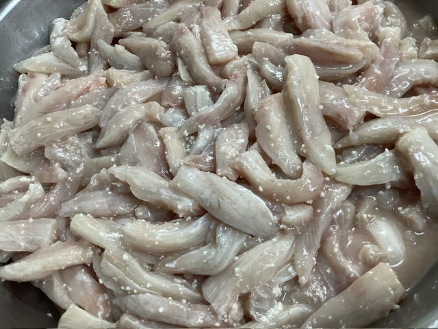 フェスタでは醤油麹に漬け込んだものを焼きました。今日は塩麹漬けです。もともと柔らかく食べやすい天身ですが、麹の力でさらにしっとりと柔らかく、「お肉のおかわりください」とお肉と間違う子もいるほど食べ応えもある一品になりました。