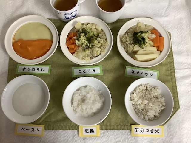 園の離乳食では、家庭で食べた食材のみを使って提供しています。毎月保護者の方に確認表記入のご協力をいただき、個別に対応しています。