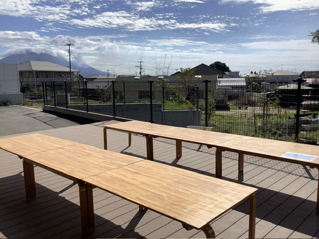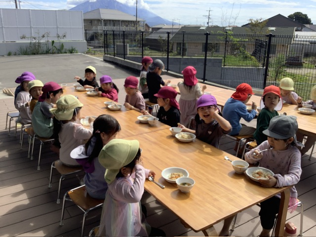 のはら園でいっぱい体を動かして遊んだ後は、テラスで給食を食べました。