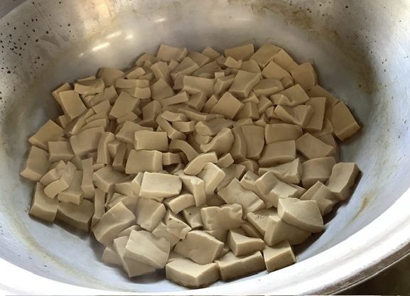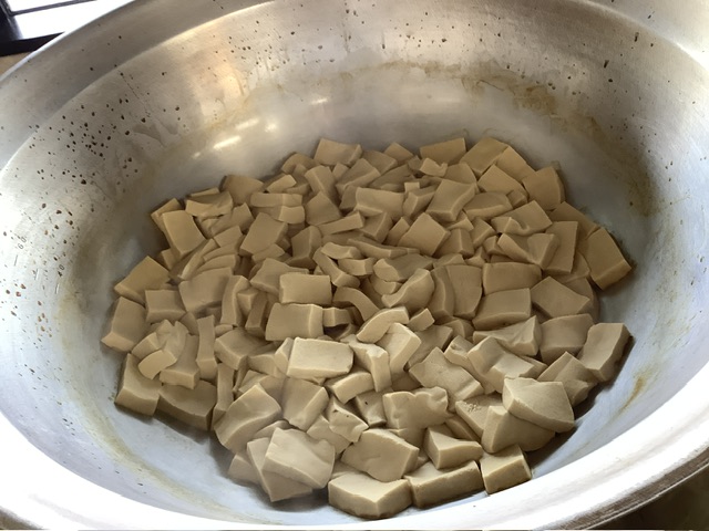 高野豆腐の旨煮は、鰹節と昆布から取った出汁に醤油や味の母・きび糖で味を付けました。