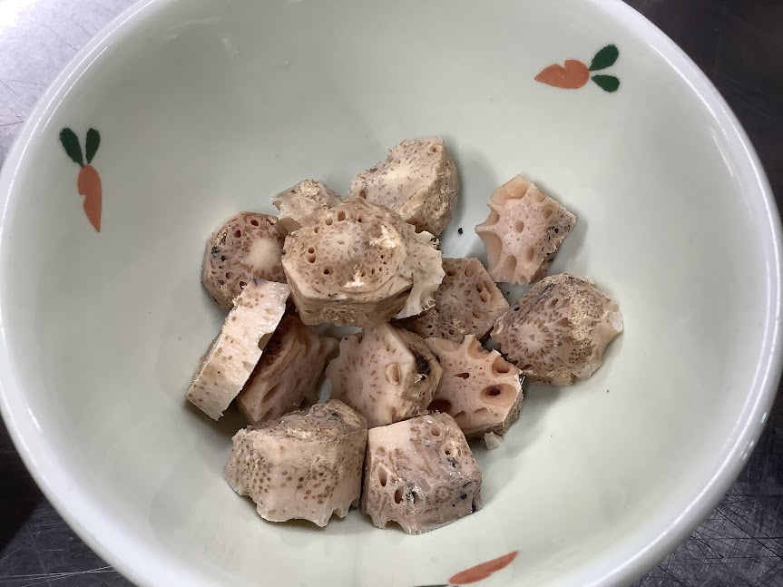 秋から美味しい季節を迎えるれんこんを使ったサラダは、泥付きの生のものを仕入れました。泥をたわしでこすって皮つきのまま調理し、皮に含まれている栄養もしっかり摂れるようにしています。