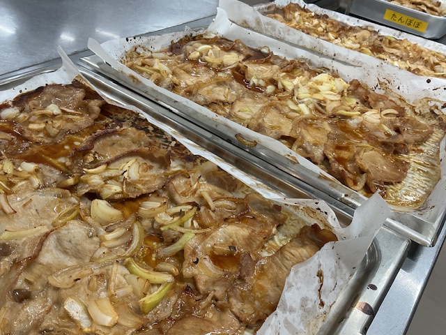 豚肉の生姜焼きは、豚のロース肉をかみ切りやすいように薄切りのものを仕入れています。玉ねぎと一緒に漬け込むことでお肉の柔らかさが増すだけでなく、玉ねぎのシャキシャキした食感もよかったです。