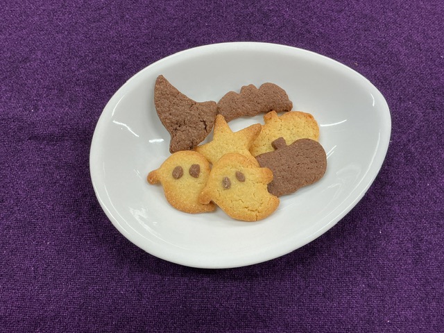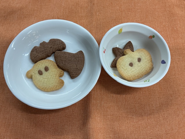園ではおやつのクッキーをハロウィンらしい型で抜いて、ハロウィンクッキーを提供しました。