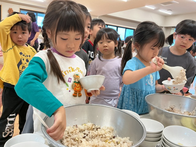 炊きあがった栗ごはんは、自分たちで配膳して食べました。おかわりまであっという間になくなっていました🌰