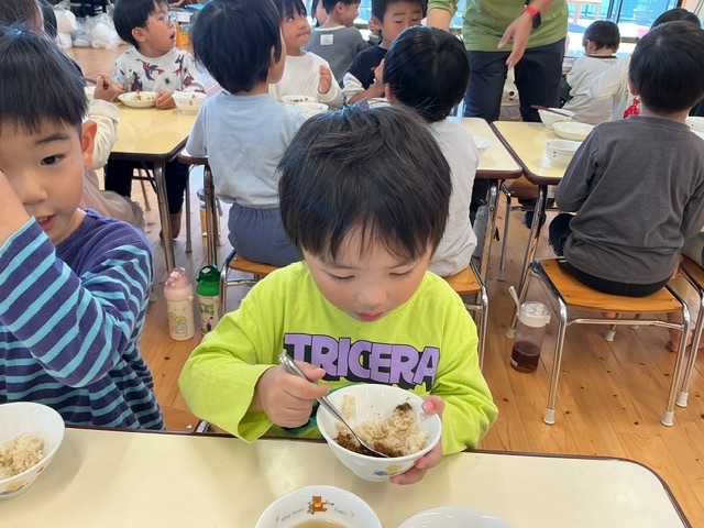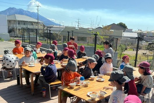 気候がよく風が気持ちよかったため、年長組はランチルーム横のテラスで給食を食べました。