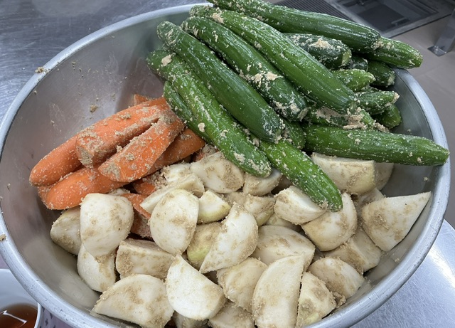 旬野菜のぬか漬けには給食室手作りのぬか床で敬愛食品より届いたきゅうりと人参、有機農家35farmから届いたかぶを漬けました。ぬかの旨みと塩味のバランスが良く美味しいぬか漬けが出来上がりました♪