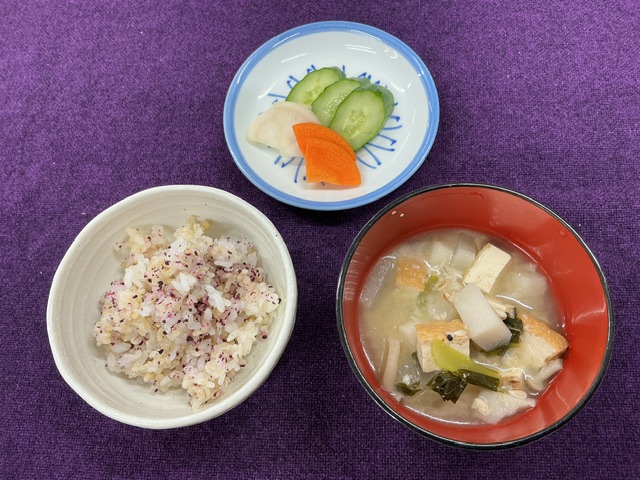 人参、大根、ほうれん草をみそ味で仕上げました。たんぱく質は豆腐です。