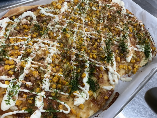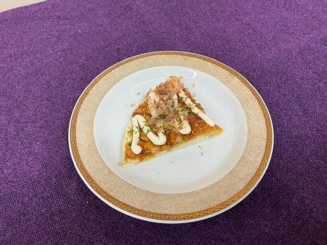 15時のおやつはお好み焼き風ピザです。年少(3歳児)のクラスでは給食が終わった時に今日のおやつのメニューを聞いて時から✨「今日はお好み焼き?」「ピザ?」どっちなのか?とみんなで話をしたようですよ。