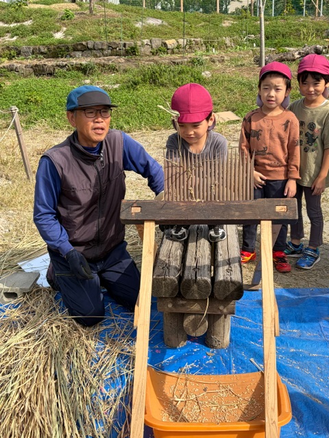 脱穀は、昔使われていた「千歯こき」を錦ヶ丘の職員がもっていたため、古式の脱穀機を使用しました。