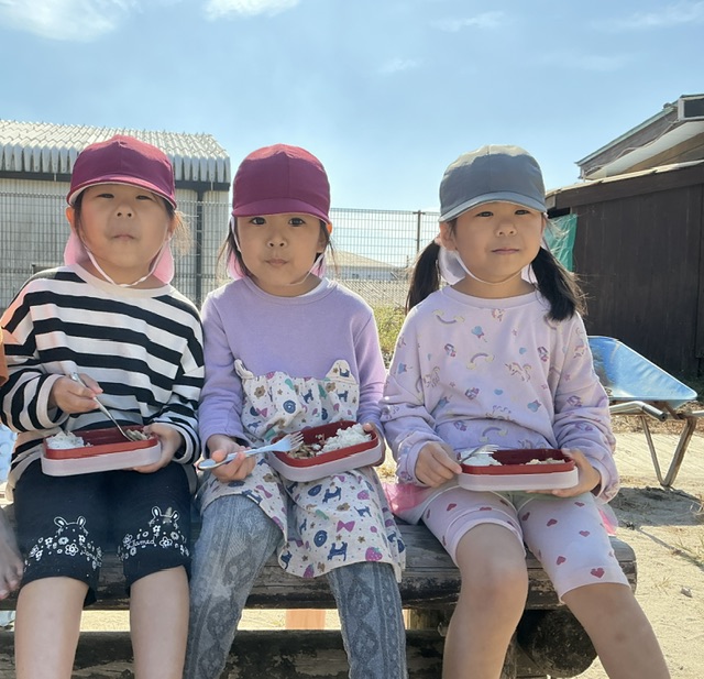 「ここにすわったらおべんとうのふたどこにおく?」「ふたをかさねたらいいかも!」
