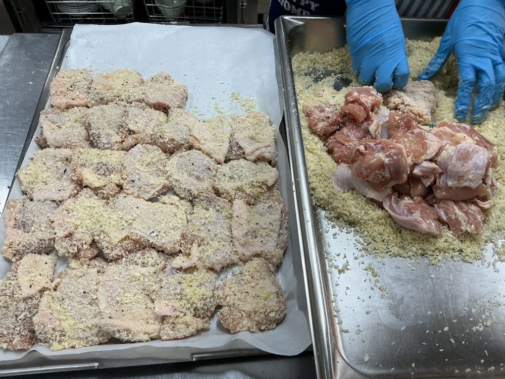 小麦粉や卵などは使わず、鶏肉に直接パン粉をまぶしました。塩で漬け込んだことで水分が出てしっとりとしていたため、薄くまんべんなくパン粉をまぶすことができました。