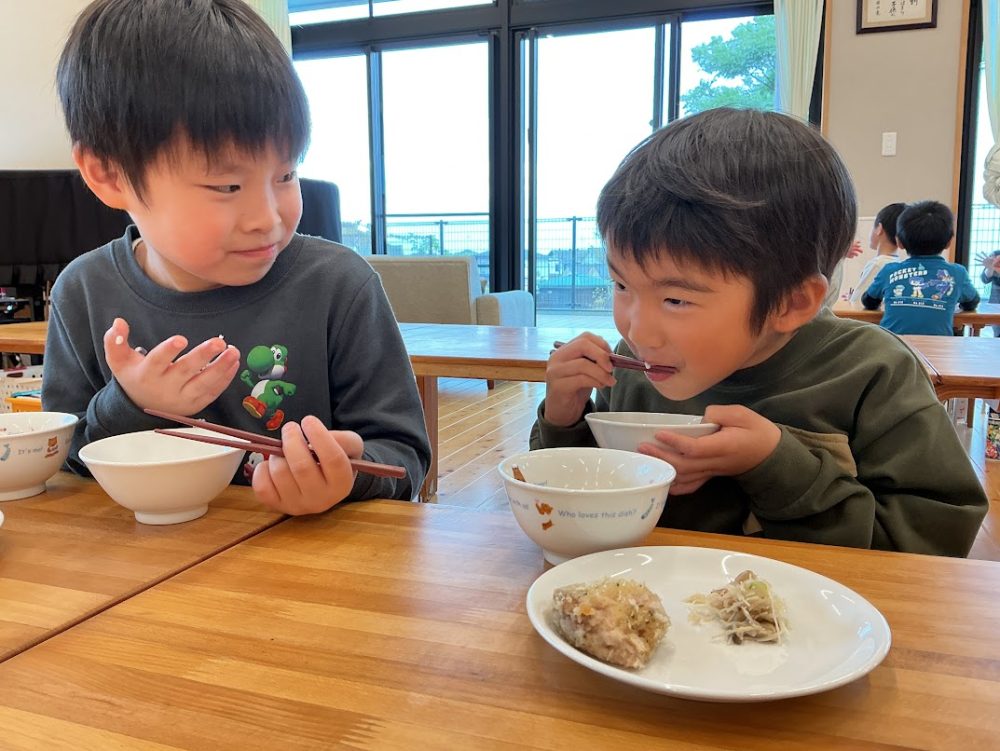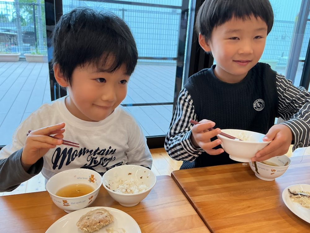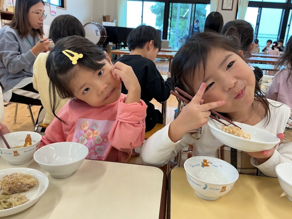 お腹がすく感覚を感じたり、自分の食べられる量を学んだり、マナーを教わったりしながら、友だちとの会話も楽しんで給食の時間を過ごしていますよ。