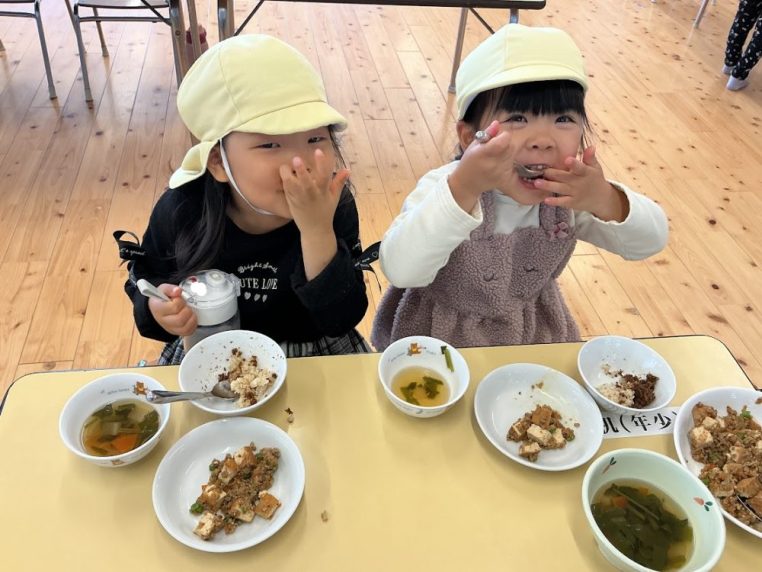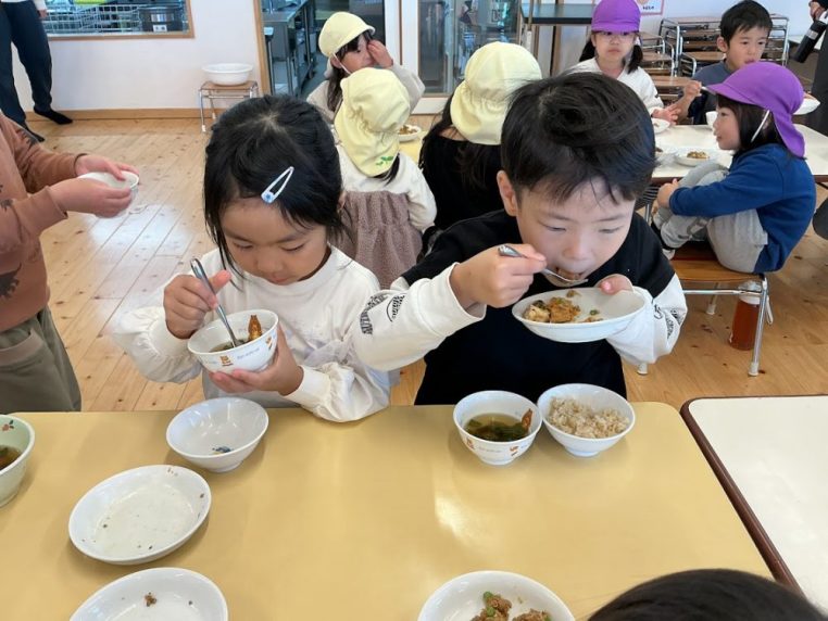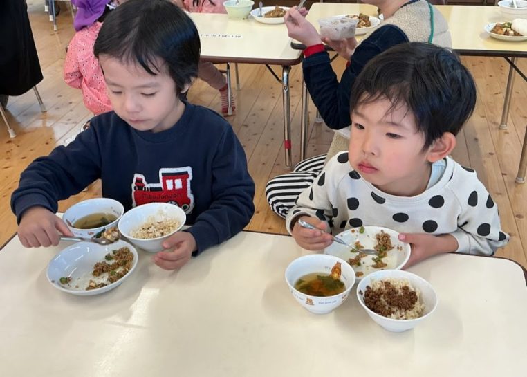 のはら園でたくさん遊んでお腹が空いた子ども達は、給食をモリモリ食べていました。帽子を取るのも忘れて食べる子どももいましたよ😋