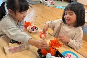 最近、「〇〇ちゃんと遊びたい」「〇〇くん、これしよう!」と、友達を誘ったり、近くで話している会話を聞いて「こうしたらいいんじゃない?」と話に混ざったりするなど、友達との関わりが増えてきています。また、「〇〇が楽しかった」「これをやりたい」など、これまでは表情や態度で表現していた気持ちを言葉で伝えようとする姿も少しずつ見られるようになってきました。