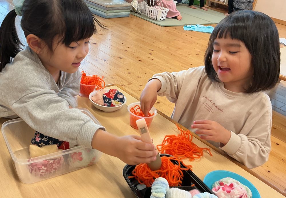 物の貸し借りや友達との会話が生まれるように、おもちゃの数を意図的に調節したり、美容室ごっこやままごとなど、一緒にイメージが広がるような遊びを準備したりします。