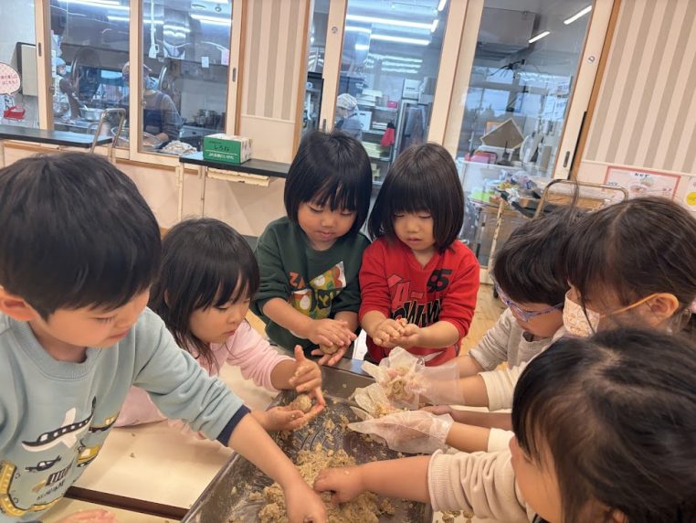 麦麹を拝み洗いすることで麦麹に傷がつき、発酵を促す効果があります。麹の香りが広がり、「もうたべられる?」「みそのにおいがする」とこども達も香りを感じていました。
