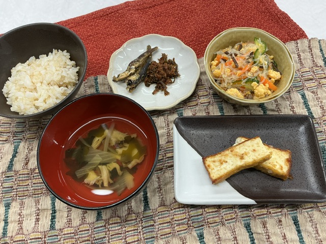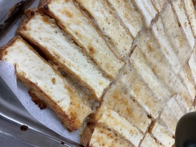 主菜の味噌マヨ焼きは、自家製の豆乳マヨネーズと麦みそを混ぜたものを薄く切った厚揚げに塗ってこんがりと焼きました。