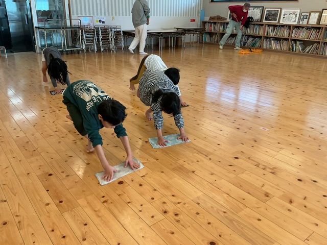 起伏のある園庭で遊び込んでいるこども達。足腰を高くあげて、安定感のある雑巾をがけを披露してくれました。