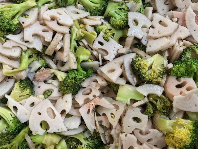 ブロッコリーとれんこんの煮びたしは、昆布と鰹節でとっただしに醤油や味の母で味付けをし、蒸した野菜を漬けこみました。