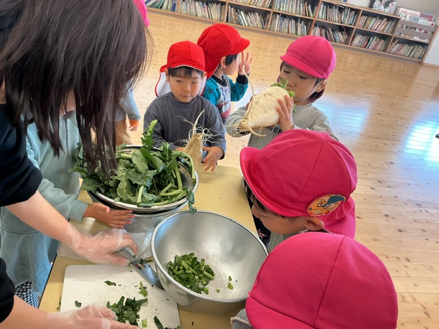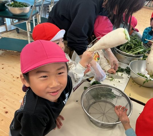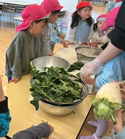 園庭の畑には、【かわいい大根】や【桜島大根】などいろいろな品種の大根が植えてあります。