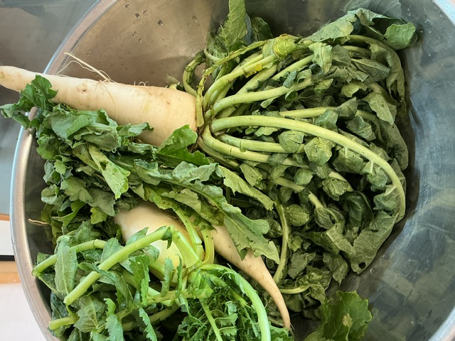 穫れ立ての桜島大根は新鮮で、固そうに見える葉も柔らかく、生で食べてもえぐみも苦みもありませんでした!