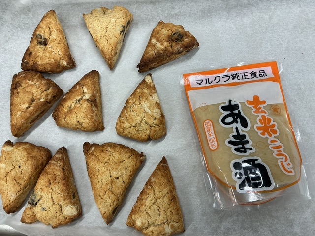 おやつ作りに甘酒を使うことで、きび糖の量を減らすことができます。またしっとりさも加わり、食べやすいスコーンに仕上がりました。