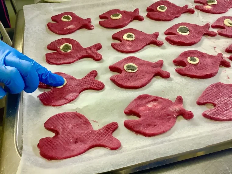 他のものはないかと考えなおすことにしました。その前の週に、ランチボックスで黒米ごはんを食べていたので、「ごはんに混ざってた赤いお米は?」(こども達には黒米が赤く見えたようです。)「赤飯はどう?」という意見から、小豆の煮汁という案が出ました。また、給食室にも相談にきてくれたので、以前【きんぎょがにげた】クッキーを作ったときには【ビーツ】という野菜を使ったんだよ、ということを伝えました。