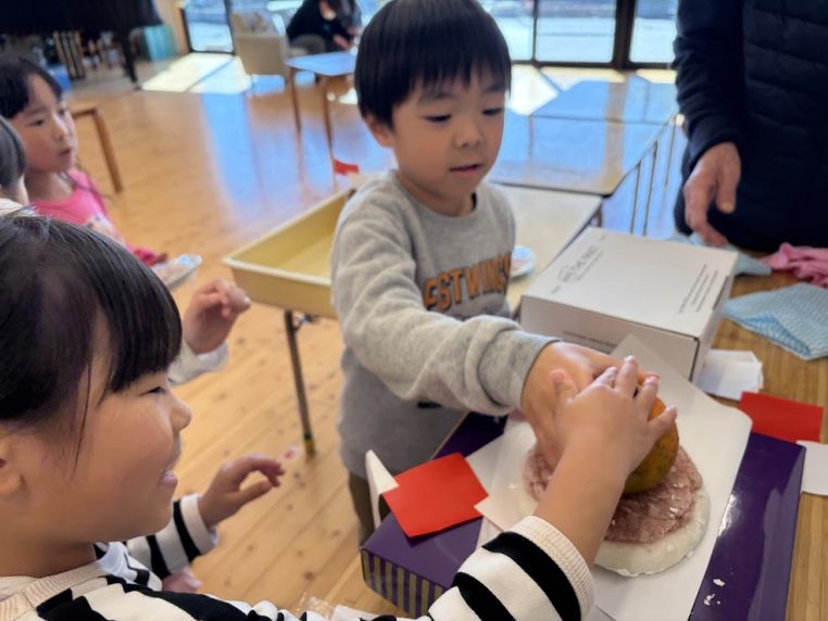 お汁は、里芋やごぼう、園庭で収穫した桜島大根、大根葉、鶏肉など具沢山に仕上がりました。新鮮な園庭の野菜は甘味もありとても美味しかったです💓
