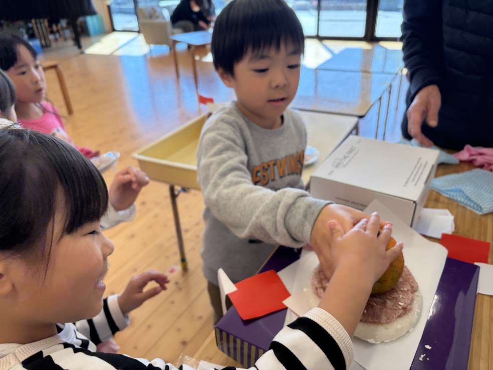 先日もちつき会で作った紅白餅を使って、鏡餅を作りました。