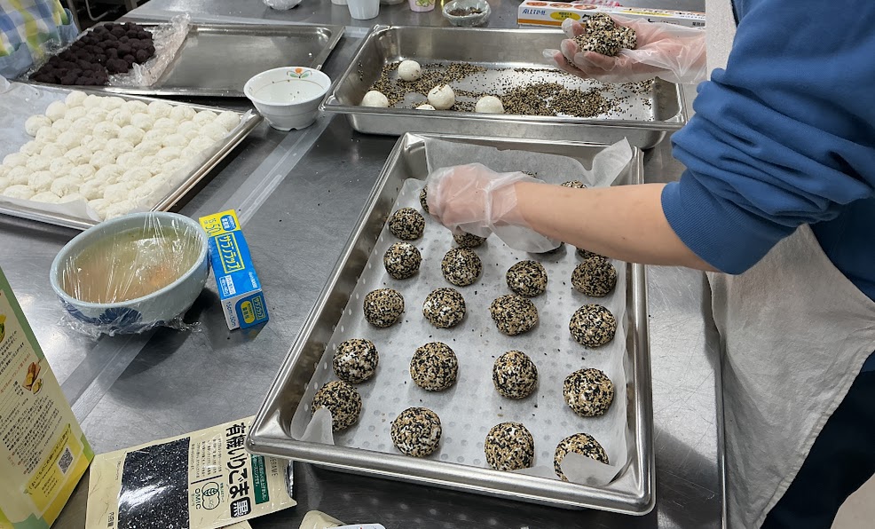 また、ごまがつきやすいように少量の米油を表面につけたり、生地に白玉粉に加えて木綿豆腐と上新粉を混ぜ込むことで誤嚥・窒息を防止する工夫もしたりしています。