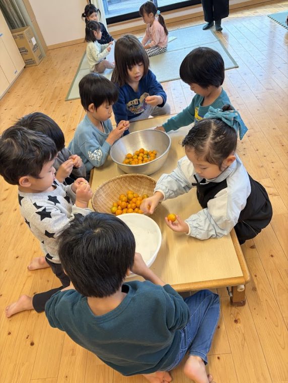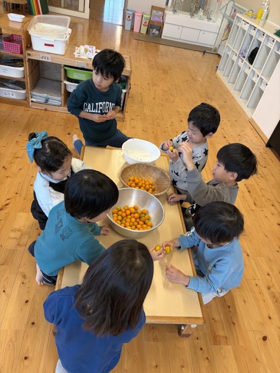 この金柑のヘソ取りは、3~5歳児が協力してくれました💪1つも取り残しなく綺麗に取ってくれてとても助かりました✨