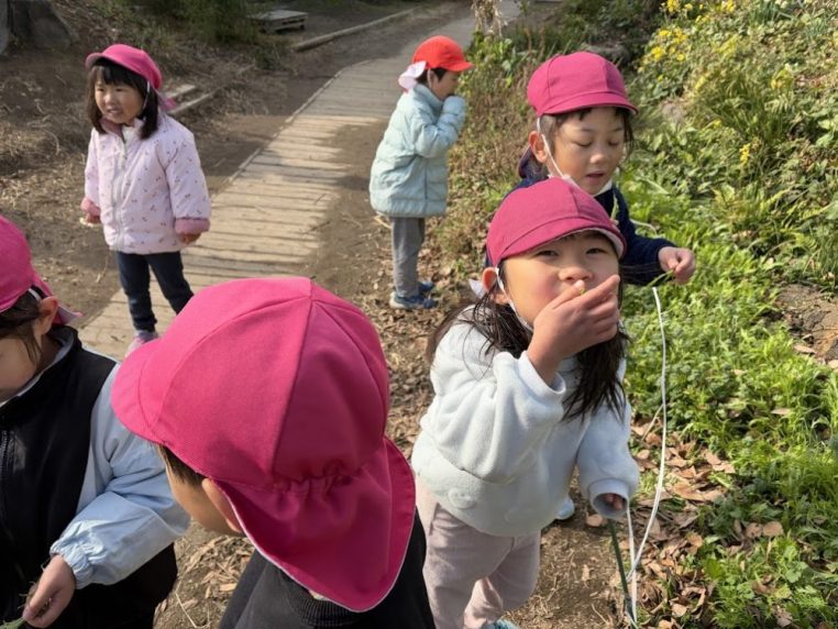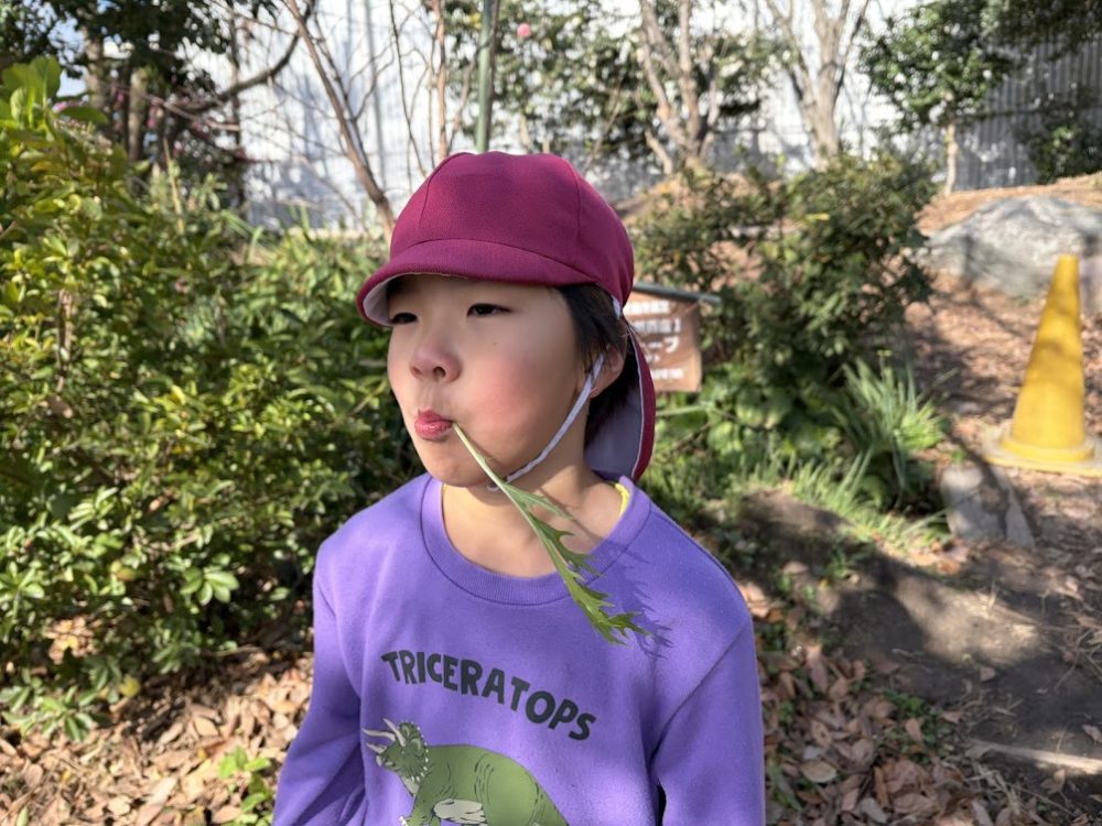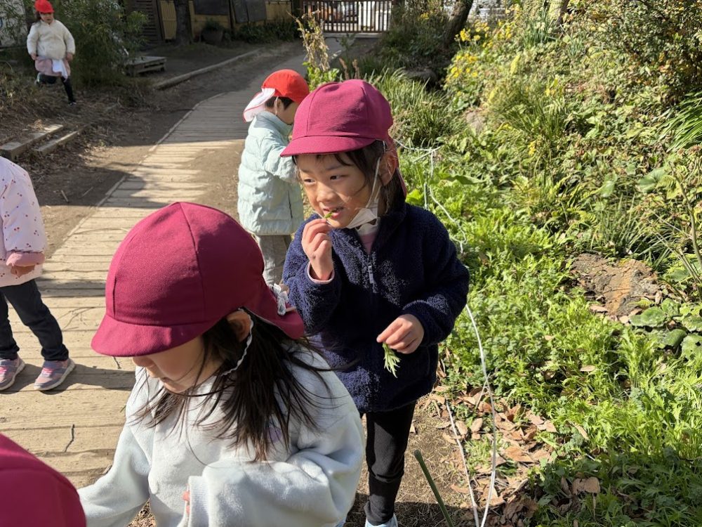 水辺の畑では水菜が育っています。雑草と一緒に生えているのですが、こども達は葉の形を見分けて、水菜を探し出していました👀