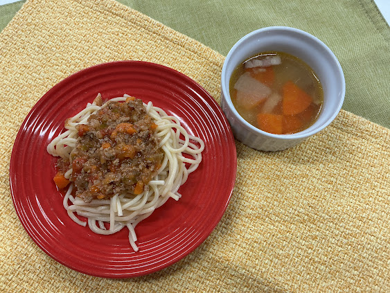 ミートスパゲティには、玉ねぎ・人参・セロリ・ピーマンの4種類の野菜が入りました。