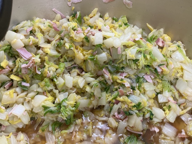 今日の副菜は橙を使って和え物を作りました。今日は白菜を8.8キロ準備しましたが、橙と南州農場のハムを使ったさっぱり和えは完食でした。