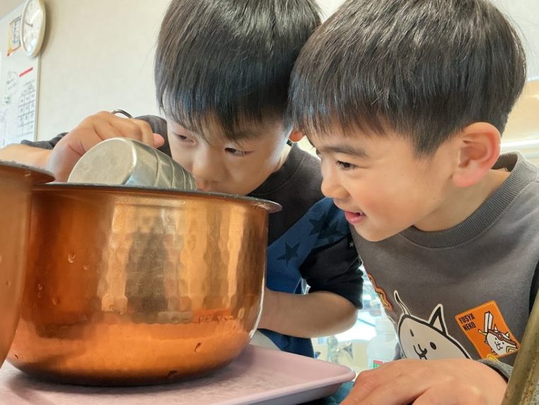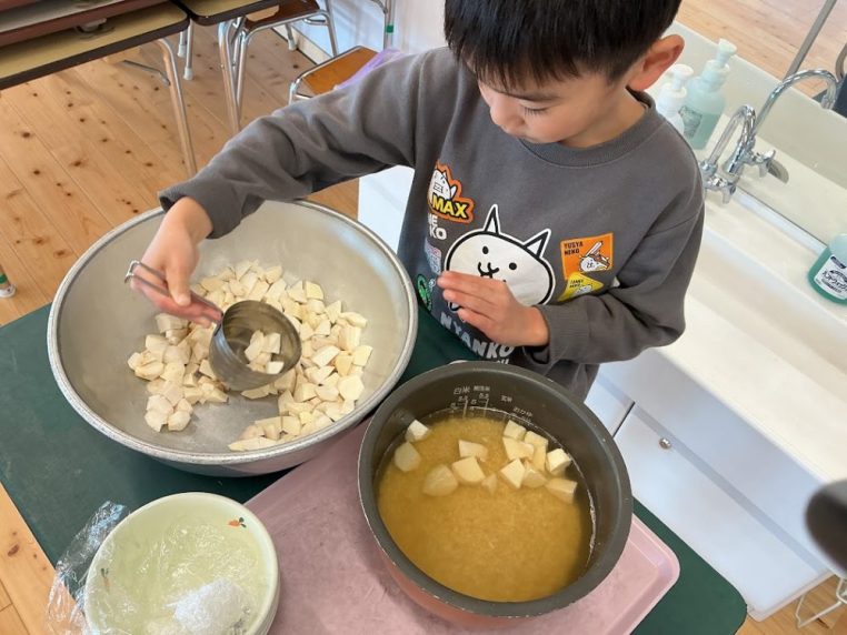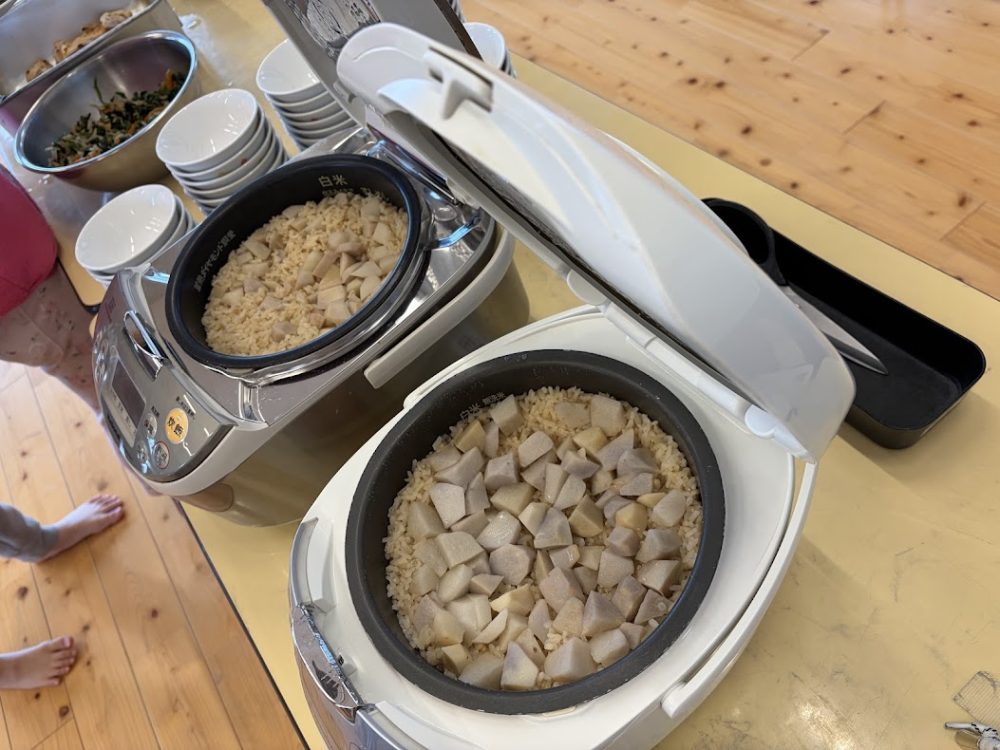 このときの「里芋ごはんにして食べたいな」とこどものつぶやきから、里芋ごはんを作ることにしました。毎週木曜日は年長組の米炊きの日です。そこで、いつもの米炊きにアレンジを加え、しょうゆや出汁、里芋を入れて一緒に炊き込みました。