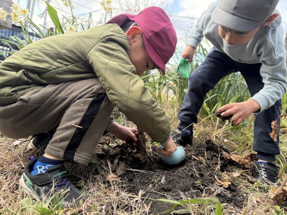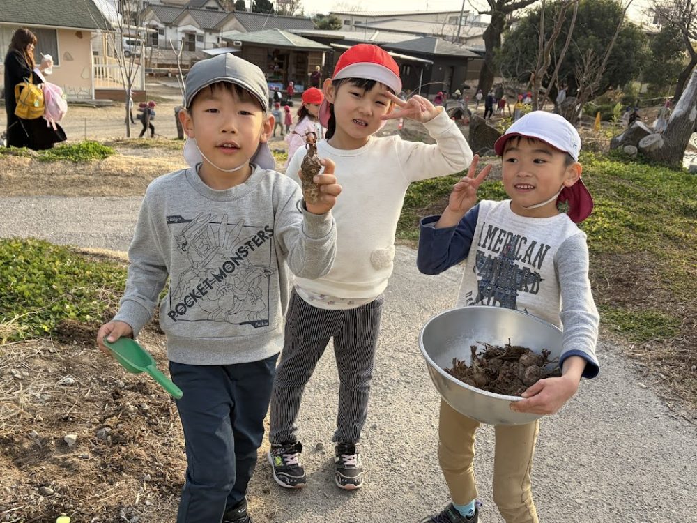 葉は枯れてなくなっていましたが、少し残っている茎を目印にスコップで掘り進めると、小さな里芋がコロコロと出てきました。日当たりが良すぎて土がカラカラしているから小さいのかな、とこども達と話しながら一生懸命探しました。