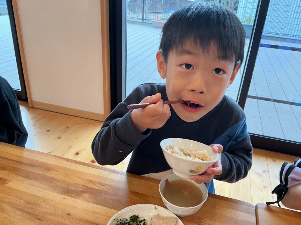 年少少組はランチルームで食べました。4月になったら毎日ここで給食を食べるんだよと聞くと、誇らしそうな嬉しそうな表情を見せてくれました。