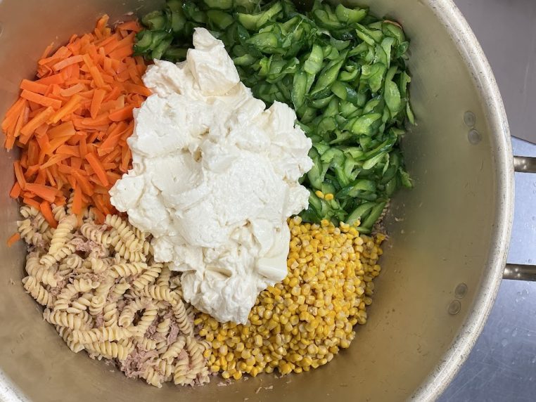 フジッリサラダのフジッリとは、らせん状のパスタのことです。らせん状になっているので味が絡みやすい特徴があります。自家製の豆乳マヨネーズで味付けしました。