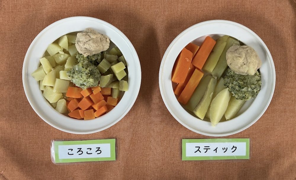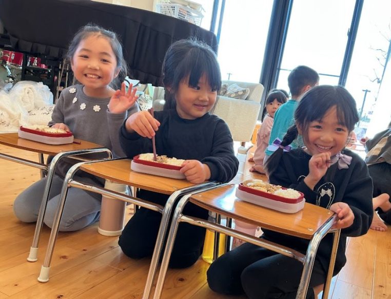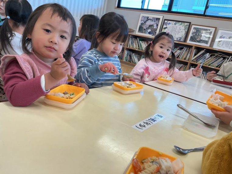 年中、年長組は2学年混ざって交流しながら食べていました。中には緊張していた子もいたようですが、年長組が「こっちにおいで」「おかわりあるんだって」とリードしながら会話が弾み、だんだん打ち解けて笑顔で楽しんでいましたよ💕