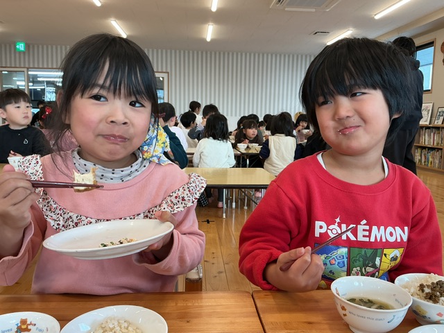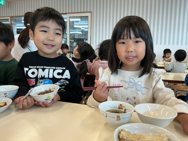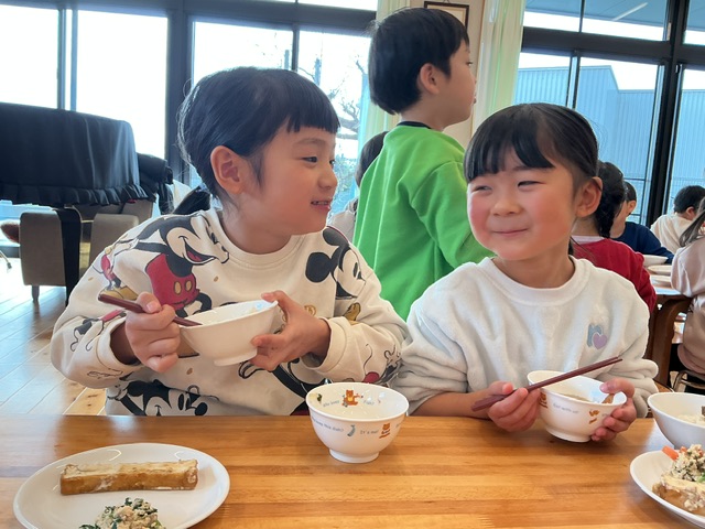 年少組のころは、自分が食べることに夢中だった年長組。最近は、同じ机を囲んでいる友達と「これがおいしい」「これはなんだ?」「おかわりしようかな」など感想を述べあいながら食べている様子を目にします。