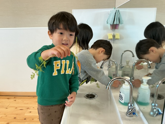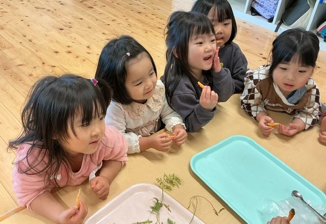 「このにんじんあまい!」「シャキシャキしているね!」「ちょっとにがい…」とそれぞれの感想を伝え合っていました。