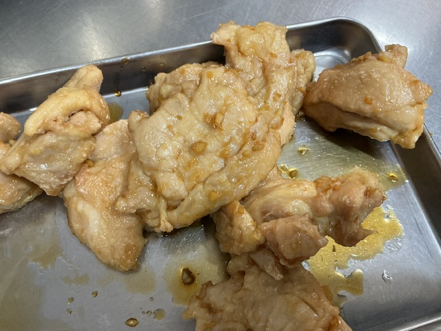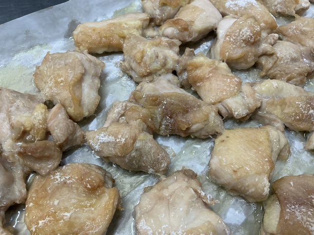 鶏肉の甘酢焼きは、鶏肉に塩で下味を付けたあと、片栗粉をまぶし焼きました。